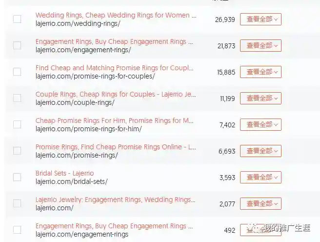 例如我做的的是情侣戒指的网站,现在要投放谷歌搜索广告,首先我会找几个竞争对手网站,找到了网站:,需要利用的工具网站:,在工具网站输入目标网站后,可以看到所有热门的网页。