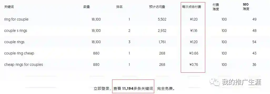 另外一个特别好用的地方在于,你可以属于特定网页,例如/couple-rings/来获取这个网页上有哪些关键词。