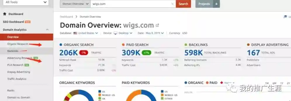 利用到的工具:,这两个网站都是付费才可以享受到完整的功能,当然如果有必要的话,我还是建议购买一个,similarweb一个月199刀,semrush一个月99刀,一般选择semrush就够用了。来看下semrush的具体一些找关键词的功能。(1)输入关键词,你可以看到系统会列出来广泛关键词,匹配关键词,完全匹配关键词都有哪些,搜索量和cpc出价是多少。