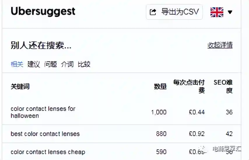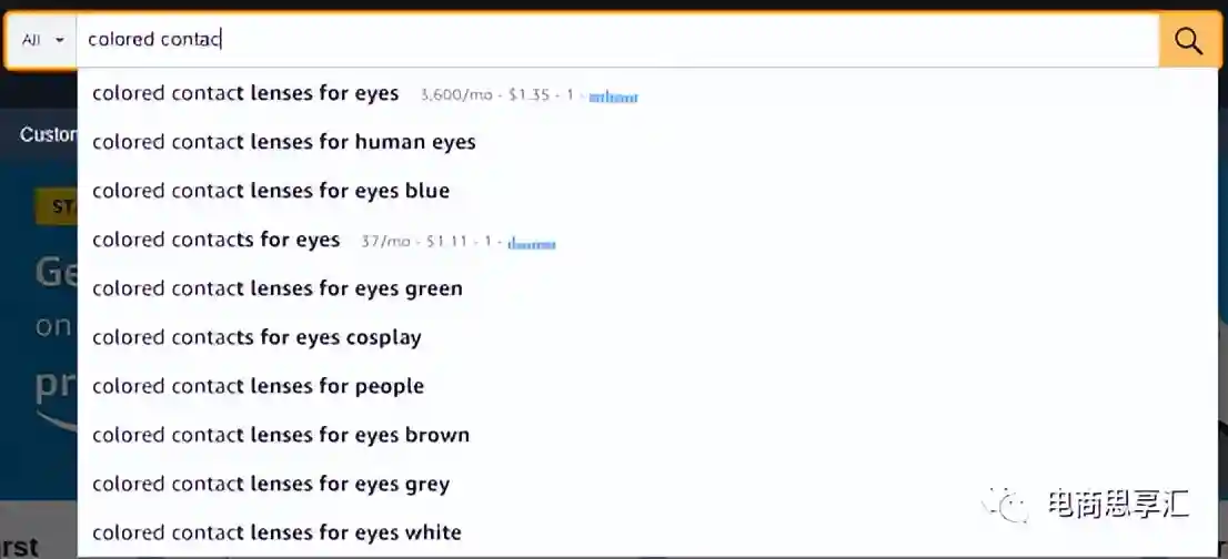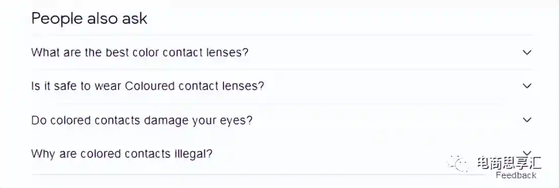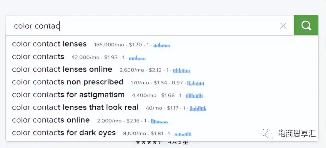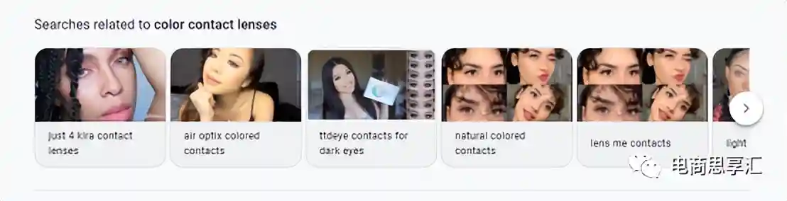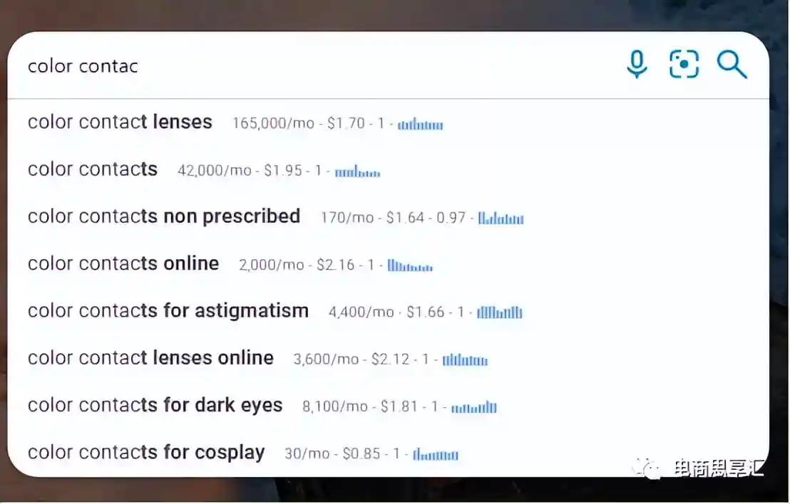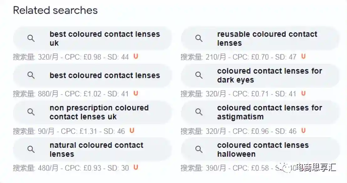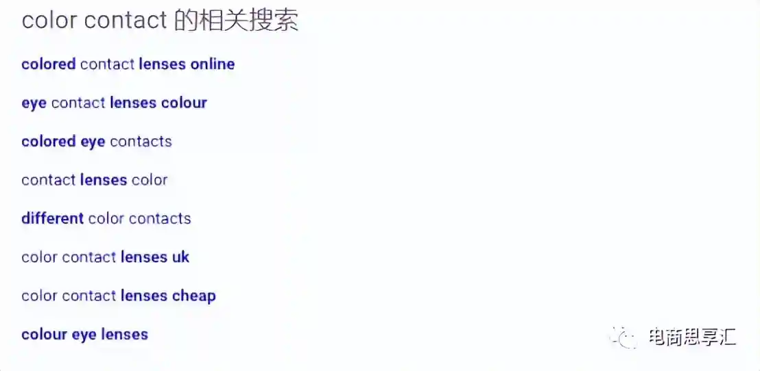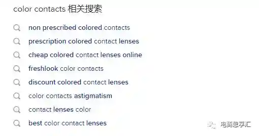 例如我在google中输入了colorcontacts,google在输入的时候自动填充了用户常搜的其他关键词,而在底部出现了相关的关键词。