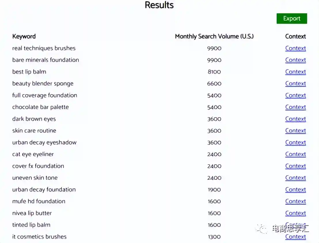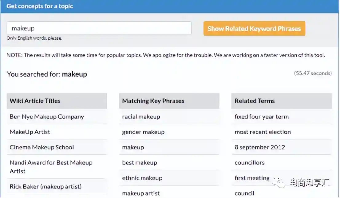 当然你可以使用工具Karooya查找到维基百科中关于某个关键词的其他相关关键词。但这个工具的缺点就是:有些小众的词语他无法查询统计到,这里举了“makeup”这个词语做了例子。