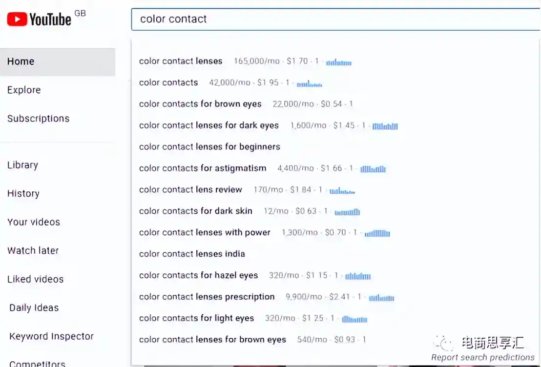 在Youtube上输入我们的核心关键词,这里会自动推荐出用户常搜的关键词。