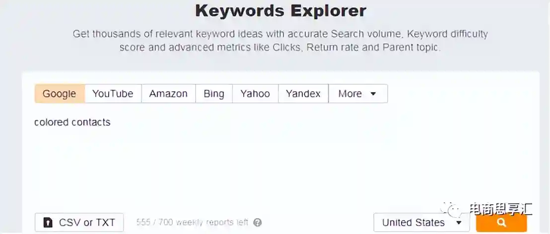 Ahrefs不仅可以查看某关键词在google中的搜索数据,还可以搜索其在youtube,、amazon、bing、yahoo等搜索引擎上的数据。