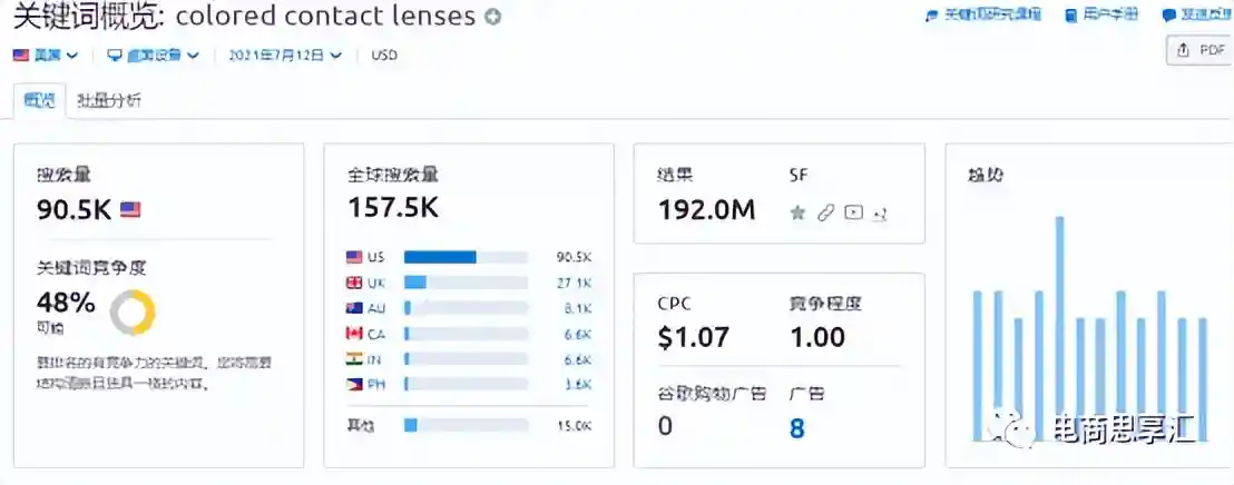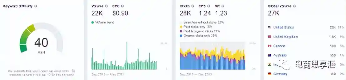 在Semrush,ahrefs上可以对关键词进行非常细致的分析,包括:搜索量、竞争难易程度、搜索结果、趋势、相关关键词和相关问题、该关键词对应的搜索结果SERP结果、广告创意等信息,可以为我们提供比较全面的分析。