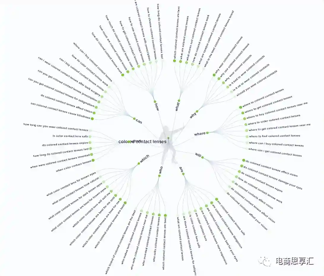 利用AnswerThePublic查找长尾主题和关键词,他是以一些常用问句的形式将长尾关键词展现出来,我们可以创造内容去布局这些长尾关键词。