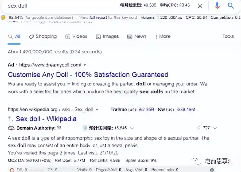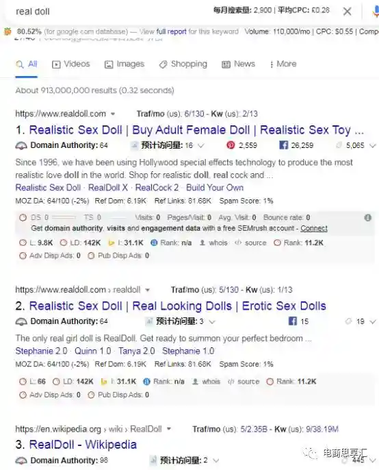 例如,我们在做实体娃娃的时候,realdoll这个词是真实的娃娃,是一个品牌词,但是因为是行业中比较久比较大的品牌,这个词已经成为了行业词,和sexdoll,lovedoll一样的存在。它流量比较大,因此我们创造一个博客,希望去抢占这个关键词的排名,但是当我们在google中搜索这个词语的时候,我们发现它背后的意图是导航,用户只想通过搜索这个词语,进入这个网站,并不想看到这个词相关的博客或者其他内容,最后我们放弃了这个词的排名竞争。