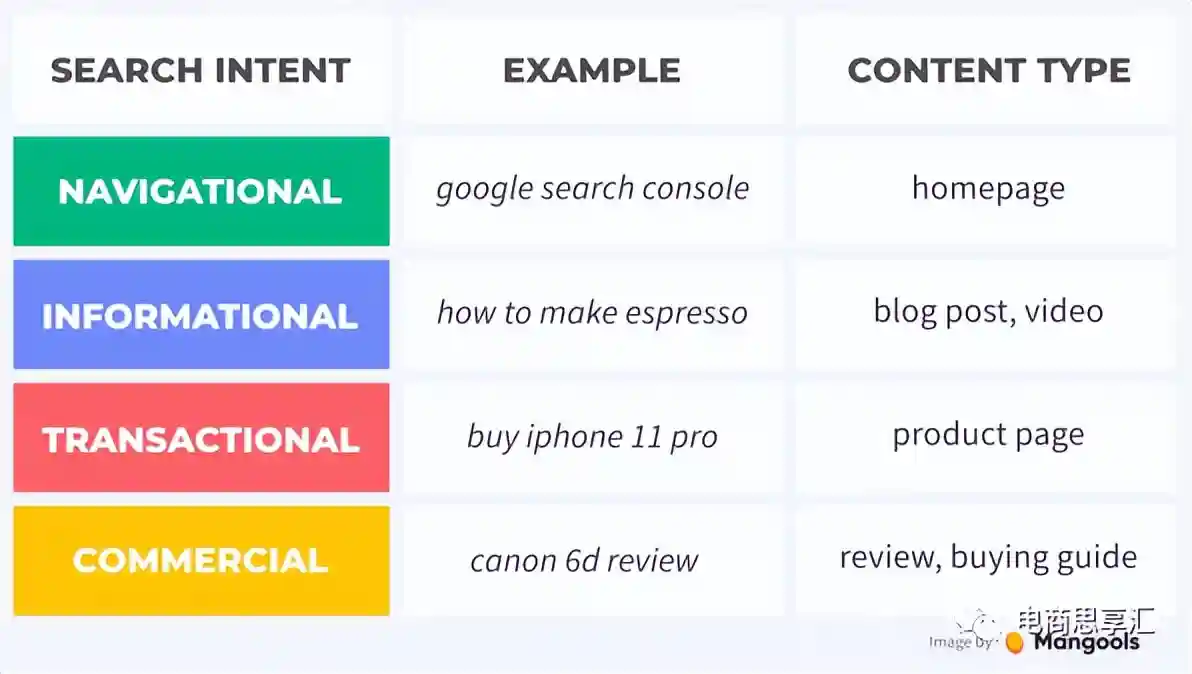 我们的业务有成千上万个关键词,但是每个关键词背后用户的搜索意图是什么,我们要弄清楚,才能创造符合意图的内容,才能得到很好的排名。或者说我们必须选择那些和我们转化目标一致的关键词。