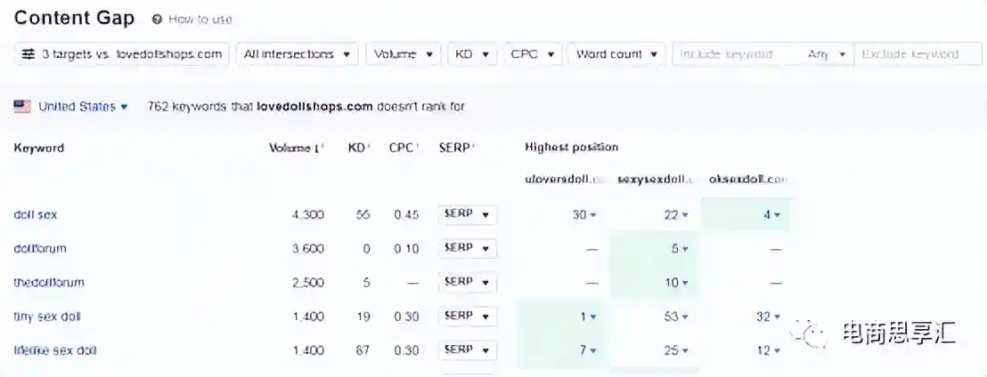 SemrushkeywordGap,AhrefsContentGap都有这个功能,可以查看我们和竞争对手的关键词差异,从而给我们提供关键词,和内容优化的建议。如果我们的大多数竞争对手目前都在某关键词上排名,那么对这个关键词的进行优化也可能非常相关且重要。如果大多竞争对手在某个关键词的排名非常靠前,那么也说明这个关键词的竞争也相对比较大。