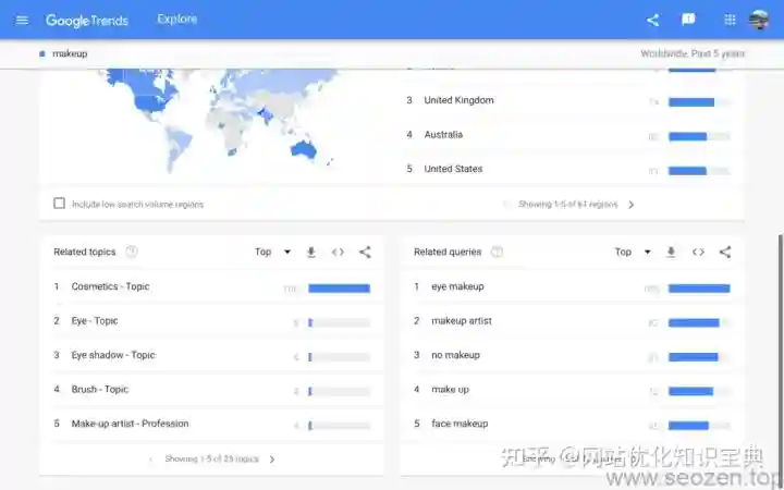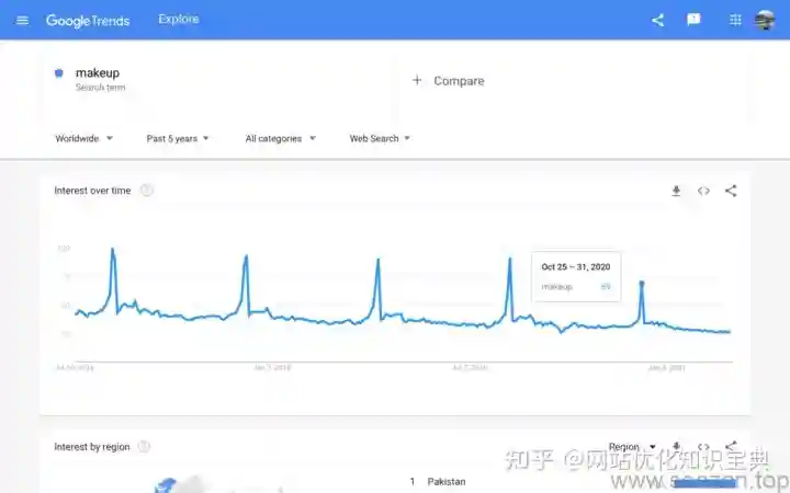 从图上面可以看到一个趋势图,左边Y坐标是0-100表示关键词热度,X坐标表示时间轴,从图上可以看到,每年的10月30号左右,这个Makeup关键词搜索热度都非常高,为什么呢?因为这几天是西方万圣节:
