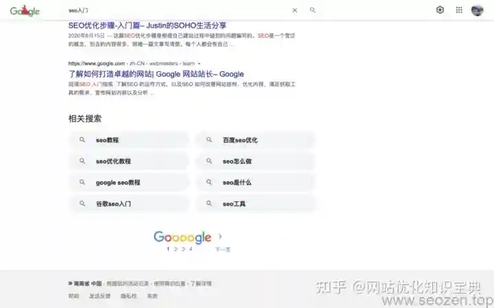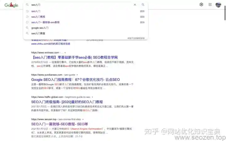 Google搜索定位关键词和长尾关键词,谷歌的下拉搜索框也是一个不错的地方,就比如SEO入门这个关键词,SEO小也的文章已经被谷歌排到了第6位,作为新站,这个位置SEO小也很知足了,说明谷歌和读者其实挺认可SEO小也的文章: